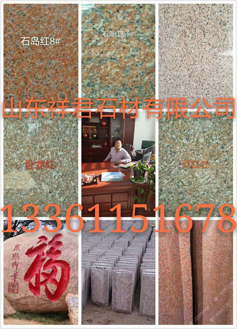 山東榮成市祥君石材有限公司廠價(jià)直銷!石島紅!!櫻花紅?。s成灰??!皇室冰花??!皇室瑪瑙 ?。? 紫晶鉆!!皇室珍珠!!皇室玫瑰!!皇室啡!!皇室棕鉆!!中磊紅!!龍須紅!!白麻!!黃金麻??!中國(guó)棕!!文登灰!等山東石材及異型加工。全自動(dòng)磨光,大型噴砂機(jī).紅外線切割。