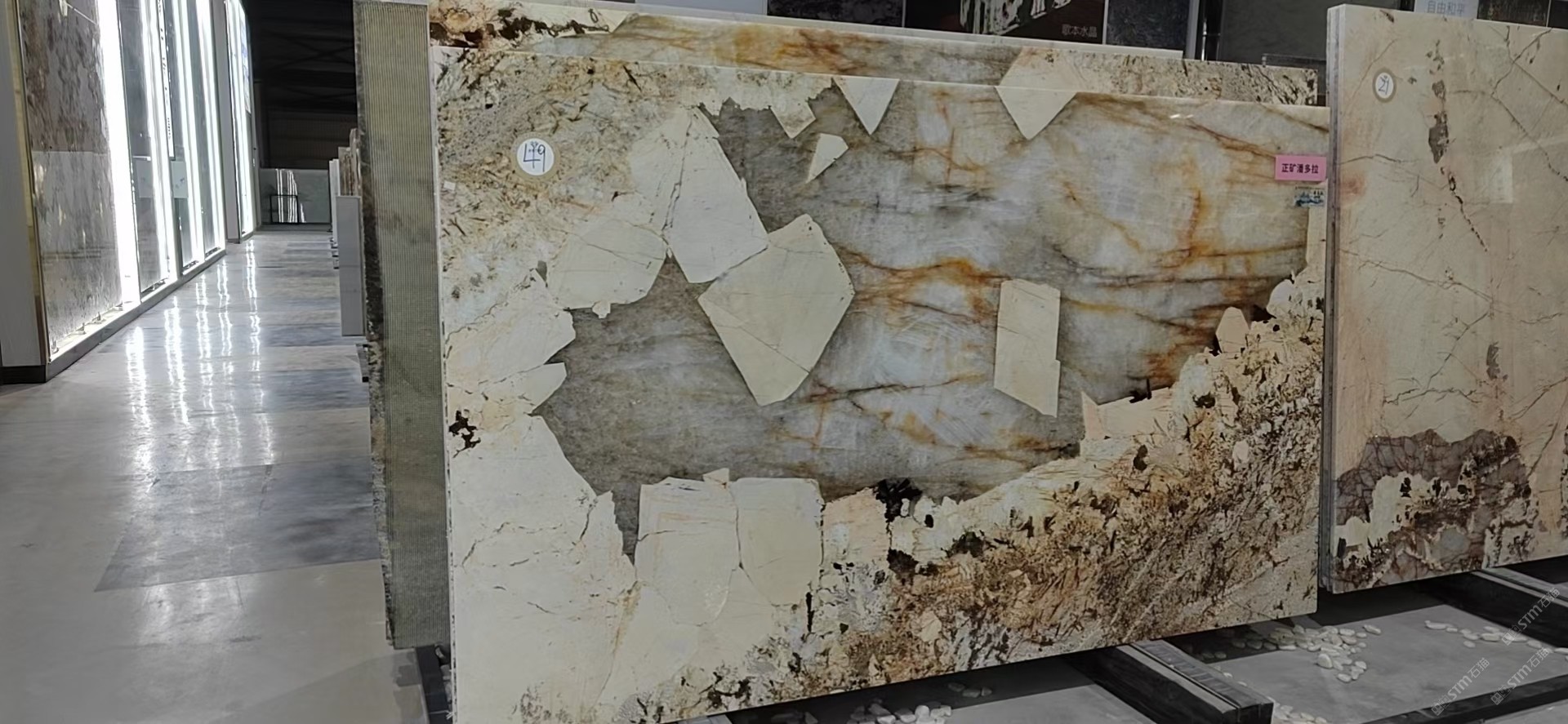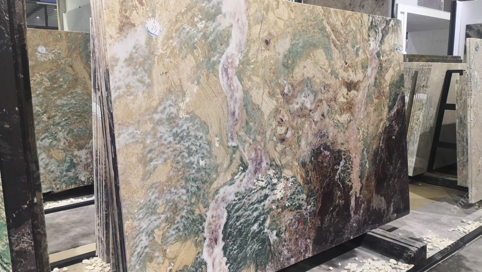 新景印象石畫館常年庫(kù)存玉石、奢石、山水畫,現(xiàn)貨大板近15萬平方,品種齊全,庫(kù)存豐富,可滿足不同客戶群各個(gè)價(jià)位板面需求。為客戶提供了更全面的選擇空間。未來,這里更將被打造成為華東地區(qū)天然背景石材選材中心。\