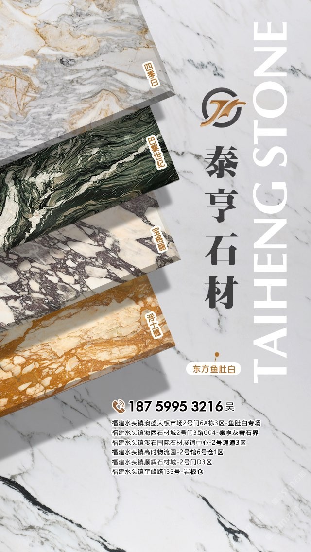 泉州泰亨石材有限公司,辦公地點位于中國石材之都—南安水頭。經營產品有:東方魚肚白(自有礦山),四季白,巴黎世紀,寶格麗,浮士德,布達拉灰(自有礦山),星空灰(自有礦山)、雅蘭云天(包礦)、蘋果灰(包礦)、銀鉆咖啡(包礦)、魚肚白、雪花白、藍金沙白金沙系列、帕斯高灰、意大利木紋、意大利,西班牙原裝進口巖板(中國總代理)、國產巖板(福建總代理)、黃斑石、意大利木紋、銀鉆咖啡,魚肚灰等優(yōu)質品種。我們以經驗豐富的采購團隊,熱情專業(yè)的銷售團隊和執(zhí)著細致的技術團隊,為客戶提供精致的產品,售前售后服務和技術支持。本著為客戶負責的態(tài)度,經過多年的潛心經營,泰亨石材在石材業(yè)界樹立了良好的信譽。如果您對我司的產品服務有興趣,歡迎在線留言或來電來函咨詢,泰亨石材在追求美的路上與您一路同行。