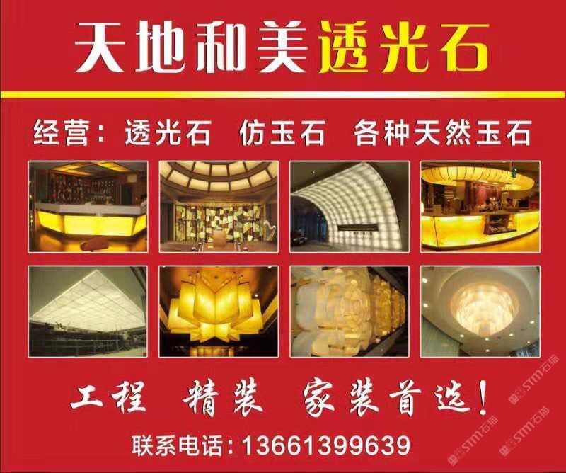 天地和美建材(北京)有限公司專業(yè)生產(chǎn)透光石、雪花石、美潔石、鳳凰石、真藏石、植物標(biāo)本生態(tài)石、云石燈飾及玉石臺(tái)盆的企業(yè),本企業(yè)擁有獨(dú)立的生產(chǎn)車間,先進(jìn)、一流的生產(chǎn)設(shè)備和精湛的生產(chǎn)技術(shù),另外,本企業(yè)擁有雄厚的設(shè)計(jì)能力和生產(chǎn)制造體系,產(chǎn)品選用優(yōu)質(zhì)的材料進(jìn)行加工生產(chǎn),生產(chǎn)過程嚴(yán)格按照質(zhì)量管理體系執(zhí)行,并且已通過ISO9000管理體系認(rèn)證,從而使產(chǎn)品達(dá)到品質(zhì)穩(wěn)定可靠、價(jià)格低廉優(yōu)惠、外觀時(shí)尚大方、進(jìn)而使產(chǎn)品享譽(yù)國內(nèi)外,遠(yuǎn)銷海內(nèi)外。本企業(yè)生產(chǎn)的產(chǎn)品廣泛應(yīng)用于燈飾、透光吊燈、燈柱、地面透光柱、透光吧臺(tái)、透光背景墻、櫥柜臺(tái)面、浴室臺(tái)面、窗臺(tái)面、洗面臺(tái)、廚衛(wèi)墻面、餐桌面、茶幾等,同時(shí)產(chǎn)品具有重量輕、硬度高、防火抗磨、耐酸、耐堿、耐腐蝕、無輻射、無縫連接、透光度強(qiáng)等多動(dòng)能特點(diǎn),也屬于新型環(huán)保裝飾材料,被配套使用于住宅、別墅、酒店、會(huì)所、商場(chǎng)及各大大型工程室內(nèi)外裝飾等眾多場(chǎng)合。本企業(yè)秉承“品質(zhì)至上,信譽(yù)”的宗旨和完善的售前售后服務(wù),贏得了廣大客戶和消費(fèi)者的一致好評(píng),熱誠歡迎各界人士前來選購、批發(fā)、工程咨詢、燈飾設(shè)計(jì)、來圖來樣定做,也歡迎各界人士蒞臨指導(dǎo)。