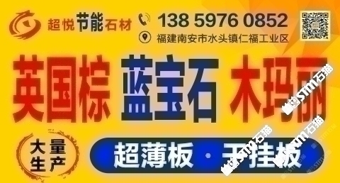 發(fā)布信息: 木瑪麗/藍(lán)寶石/英國棕(超薄板)吳總 13859760852手機(jī)微信同號-福建超悅石材薄板科技有限公司是一家專注于生產(chǎn)、研發(fā)花崗巖超薄板的研發(fā)型企業(yè),秉承“用創(chuàng)新的芯、做超薄的板、走節(jié)能的路”的發(fā)展理念,在多年來堅持不懈的努力下,成功地研發(fā)了擁有環(huán)保性能及高新技術(shù)的超薄板,其優(yōu)點可與國際薄板加工技術(shù)媲美。 花崗巖超薄板被廣泛應(yīng)用于復(fù)合板領(lǐng)域,包括保溫材料和鋁蜂窩等,是建筑外墻裝飾材料的。該產(chǎn)品降低了建筑成本、節(jié)約了裝飾 材料,縮短了施工周期,是當(dāng)今社會廣為提倡和國家大力推廣的綠色、環(huán)保、節(jié)能建筑裝飾材料。 公司堅持奉行“創(chuàng)新永不止步,品質(zhì)始終如一”的經(jīng)營理念,爭創(chuàng)花崗巖超薄板領(lǐng)導(dǎo)品牌,將花崗巖超薄板做專做精做廣做強(qiáng)。