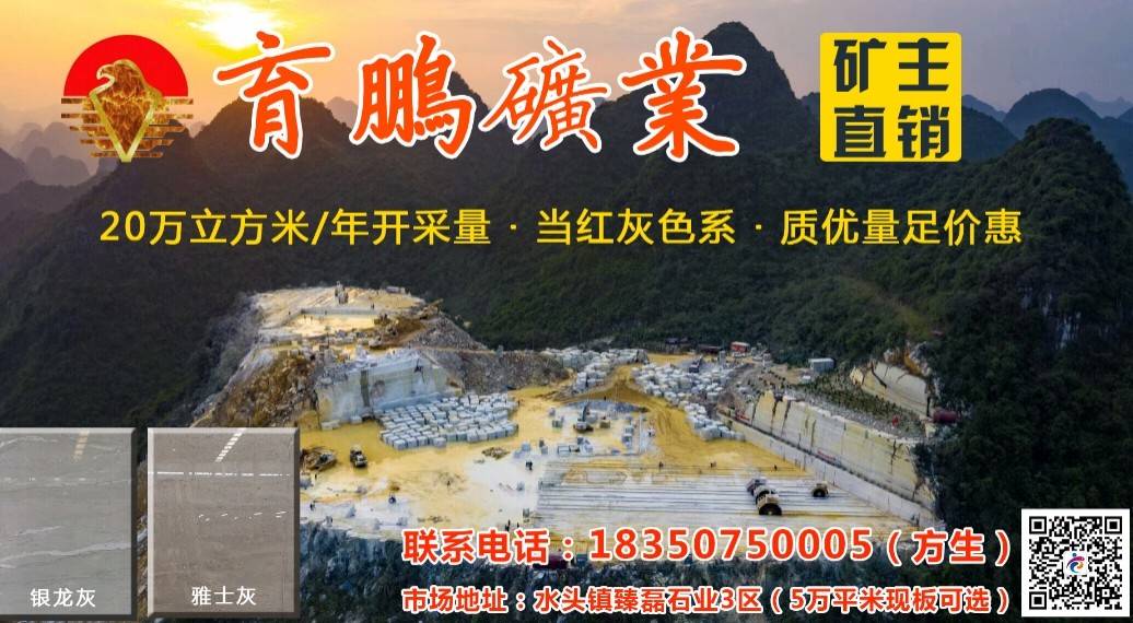 育鵬石業(yè) 聯(lián)系人:何先生    135****5638 查看 135****5638 查看 主營(yíng)范圍: 大板批發(fā)、荒料、礦山、大理石加工、 企業(yè)地址:福建南安萬(wàn)隆石業(yè)3號(hào)門走到底育鵬礦業(yè)