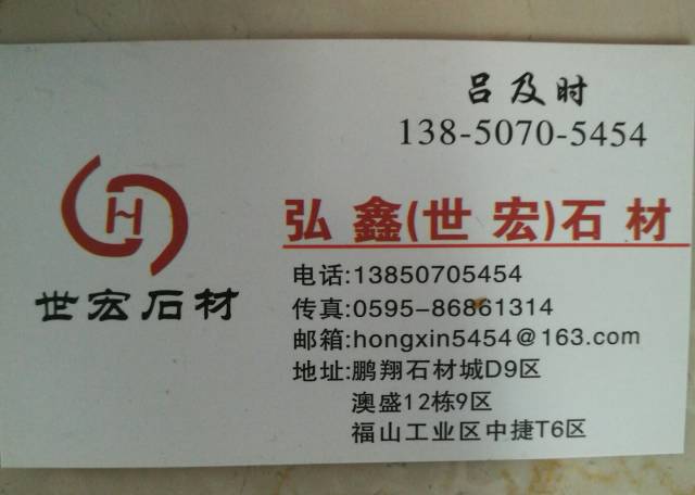 世弘石業(yè) 聯(lián)系人:呂先生    138****5454 查看 135****9039 查看 主營(yíng)范圍: 大板批發(fā)、 企業(yè)地址:福建泉州輝盛大板市場(chǎng)B區(qū)-4 萬(wàn)和石材
