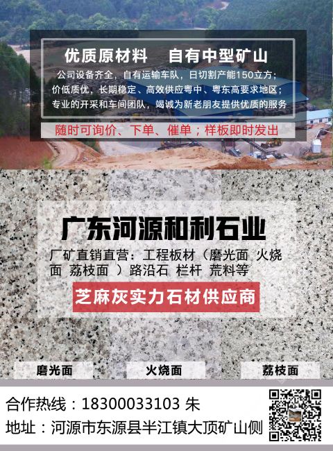 發(fā)布信息: 廠礦直銷廣東省河源市新礦芝麻灰, 部分庫存貨路沿石低至980元立方; 主營:規(guī)格板材、路沿石、欄河等。 常規(guī)700頭路沿石含運費至河源地區(qū)約1350~1380元/立方,至惠州地區(qū)約1380~1400元/立方,至深圳、廣州、東莞、清遠潮汕地區(qū)約1400~1450元/立方等; 2.5厚300*600火燒板至河源地區(qū)約55元/平方,惠州地區(qū)約57元/平方,至深圳、廣州、東莞、清遠潮汕地區(qū)約58元/平方等; 市政常規(guī)欄河包材料與安裝價格約430~480元/米; 承接:市政,園林,廣場等工程應用石材,熱誠歡迎各界朋友前來參觀,考察,洽談業(yè)務,期待您的咨詢。 自有礦山,廠礦直銷,無中介,質量,價格合理。 廠址:河源市東源縣半江鎮(zhèn)大頂礦山內 電話:18300033103 朱
