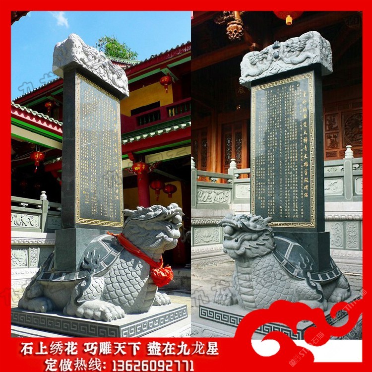 發(fā)布信息: 石雕龜馱碑?dāng)[件 龍龜馱碑圖片價格_九龍星石業(yè)。 石雕龜馱碑?dāng)[件又稱龜載碑、龍龜碑、烏龜碑、龜陀碑等。而確切的說,它應(yīng)該叫赑屃,傳說中它是龍生九子之一,力大無窮而且性格好,又善背重東西。龍龜馱碑多用于寺廟和立碑紀(jì)念,因?yàn)辇敒殚L壽的動物,古人以此建碑,也是想保存千秋萬載,讓碑流芳萬古的寄托。 石雕龜馱碑又名霸下,形似龜,傳說為龍九子之一.是老六,螭頭龜足,平生好負(fù)重,力大無窮,碑座下的龜趺是其遺像。傳說霸下上古時代常馱著三山五岳,在江河湖海里興風(fēng)作浪。后來大禹治水時收服了它,并為治水作出了貢獻(xiàn),洪水治服了,大禹擔(dān)心它又到處撒野,便搬來頂天立地的特大石碑,上面刻上霸下治水的功跡,叫它馱著,沉重的石碑壓得它不能隨便行走。