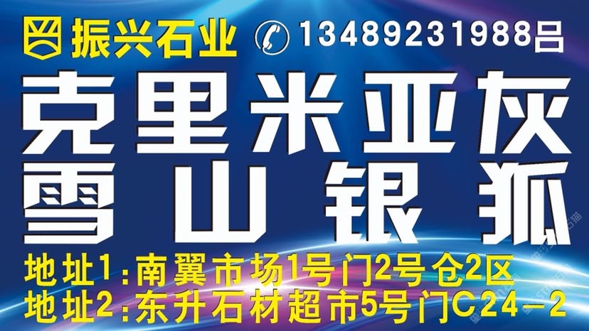 振興大理石 聯(lián)系人:呂小姐    134****1988 查看 手機(jī)號(hào)碼:無(wú) 主營(yíng)范圍: 大板批發(fā)、荒料、 企業(yè)地址:福建泉州水頭南泰石材城2號(hào)門C17