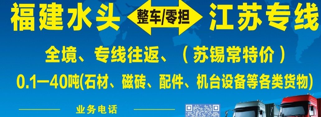 發(fā)布信息: 福建泉州水頭—江蘇全境,往返專線。 (蘇錫常特價(jià)!) 24小時(shí)在線接單 零擔(dān)~整車(chē),0.1噸—40噸。 承接各類石材,瓷磚,機(jī)械等各類運(yùn)輸。 專注運(yùn)輸,用心服務(wù)??砷_(kāi)發(fā)票。 江蘇專線15860361020。(微信同步)