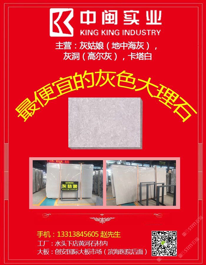發(fā)布信息: 中閩實業(yè)成立于2012年,經過幾年發(fā)展,已經成為礦山開采,大板銷售,工程板(規(guī)格板)加工銷售,一條龍的石材企業(yè),公司致力于成為國內的灰色大理石出口商,同時大力發(fā)展國內業(yè)務,主營品種:灰姑娘,高爾灰(灰洞),不管是荒料,大板還是成品,也不論是磨光面,還是啞光,噴砂,酸洗,鋼刷,拉絲,皮革,滾磨,只要是灰姑娘和高爾灰,1.8還是3公分亦或者是其他厚度,反正找我們沒錯,公司自有加工廠(只加工自己的訂單),趕進度的,不趕進度的,通通可以滿足.13313845605趙先生,創(chuàng)安國際大板市場E3區(qū),工廠:水頭下店黃河石材內