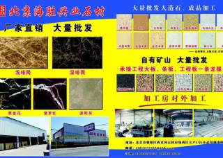 北京海勝興業(yè)石材主營產(chǎn)品:山東白麻,山東銹石,山東黃金麻,深啡網(wǎng),淺啡網(wǎng),新紫羅紅,阿富汗黑金花,阿拉善紅,阿拉善黃,芝麻黑654,奧特曼(人造石),淺啡網(wǎng)(人造石),水晶米黃(人造石),金晶米黃(人造石),金花米黃(人造石),珍珠白(人造石),艾美玉(人造石),冰川白玉(人造石),皓月(人造石),金玉滿堂(人造石)企業(yè)地址:北京朝陽區(qū)西直河石材市場西區(qū)大戶1號