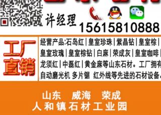 榮成市人和先業(yè)石材廠主營產(chǎn)品:石島紅,皇室珍珠,石島紅(7號),紫晶鉆,紫晶鉆1,紫晶鉆2,紫晶鉆小花,紫晶鉆大花,皇室珍珠1,中國棕,中國棕1,皇室啡4,皇室棕,皇室瑪瑙,皇室啡珠2,皇室啡珠1,皇室啡珠,皇室啡珠大花,皇室棕鉆,龍須紅G3787,乳山灰,皇室啡,石島紅(新8號),白麻企業(yè)地址:山東威海榮成市人和鎮(zhèn)寨前村